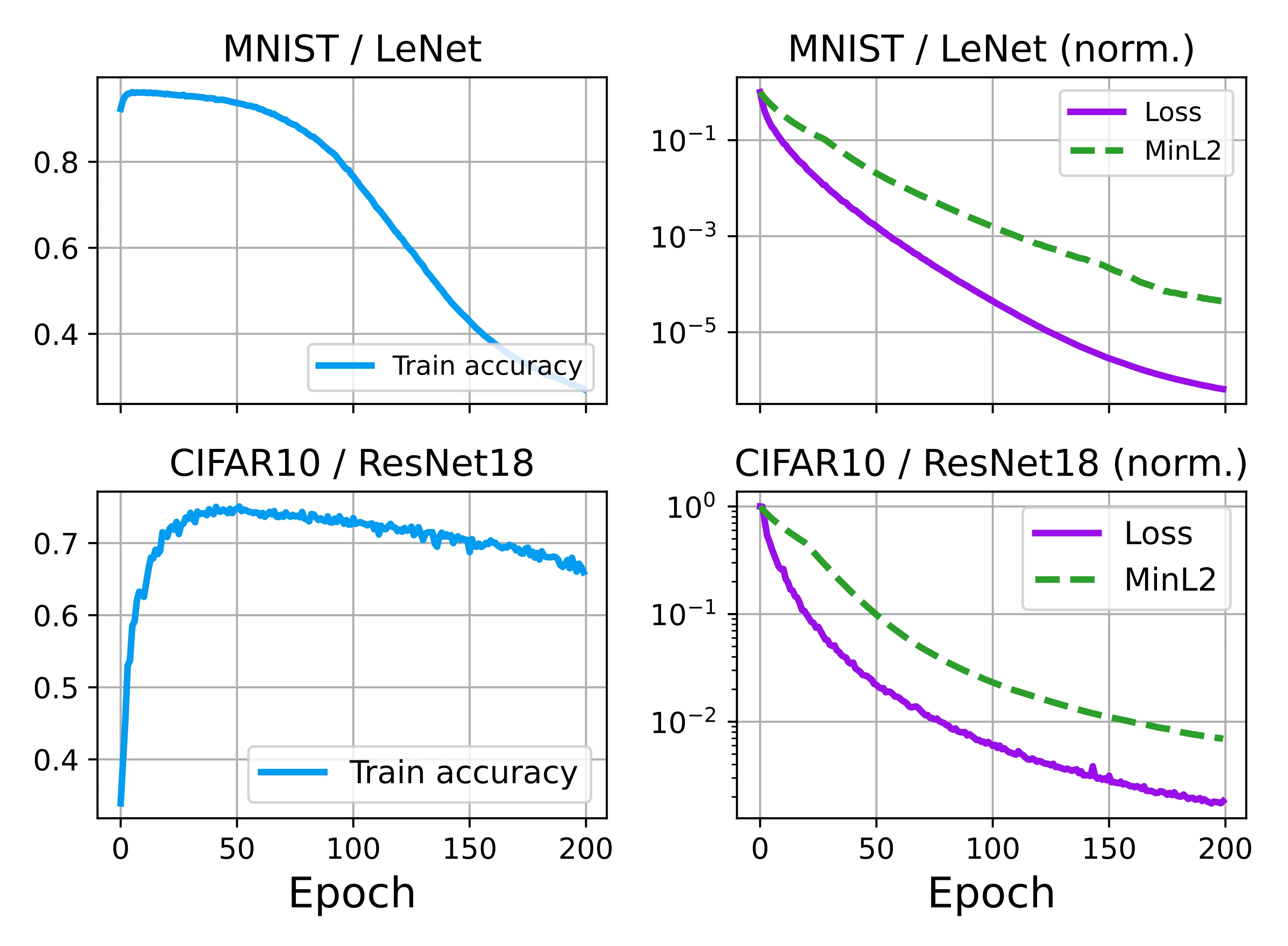 As the figure shows, accuracy rises quickly at the beginning of training. But after a certain critical point, it begins to fall even though the overall training loss keeps decreasing. More importantly, the inter-class distance (MinL2), after changing only slowly at first, then starts to shrink steadily and substantially; note that the vertical axes in the two plots on the right are logarithmic. In other words, representations from different classes drift irreversibly toward one another in the later stage of training, eventually collapsing.