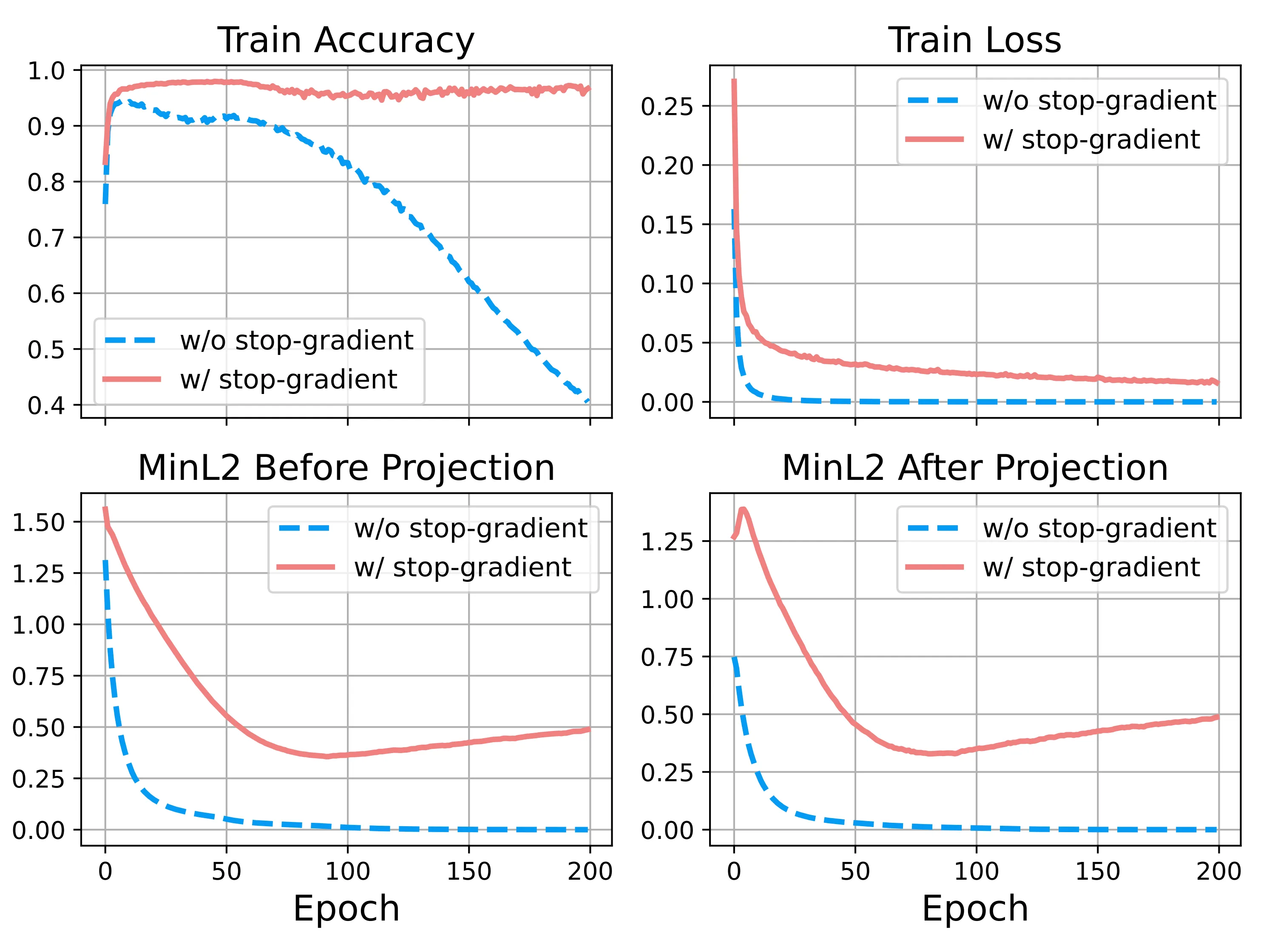 Without Stop-Gradient, accuracy reaches a peak and then gradually declines, while MinL2 keeps decaying toward zero, reflecting the progressive collapse of the representations. With Stop-Gradient, by contrast, accuracy stays high and stable, while MinL2 stops decaying and saturates at a finite value, showing that geometric separation between classes is preserved.