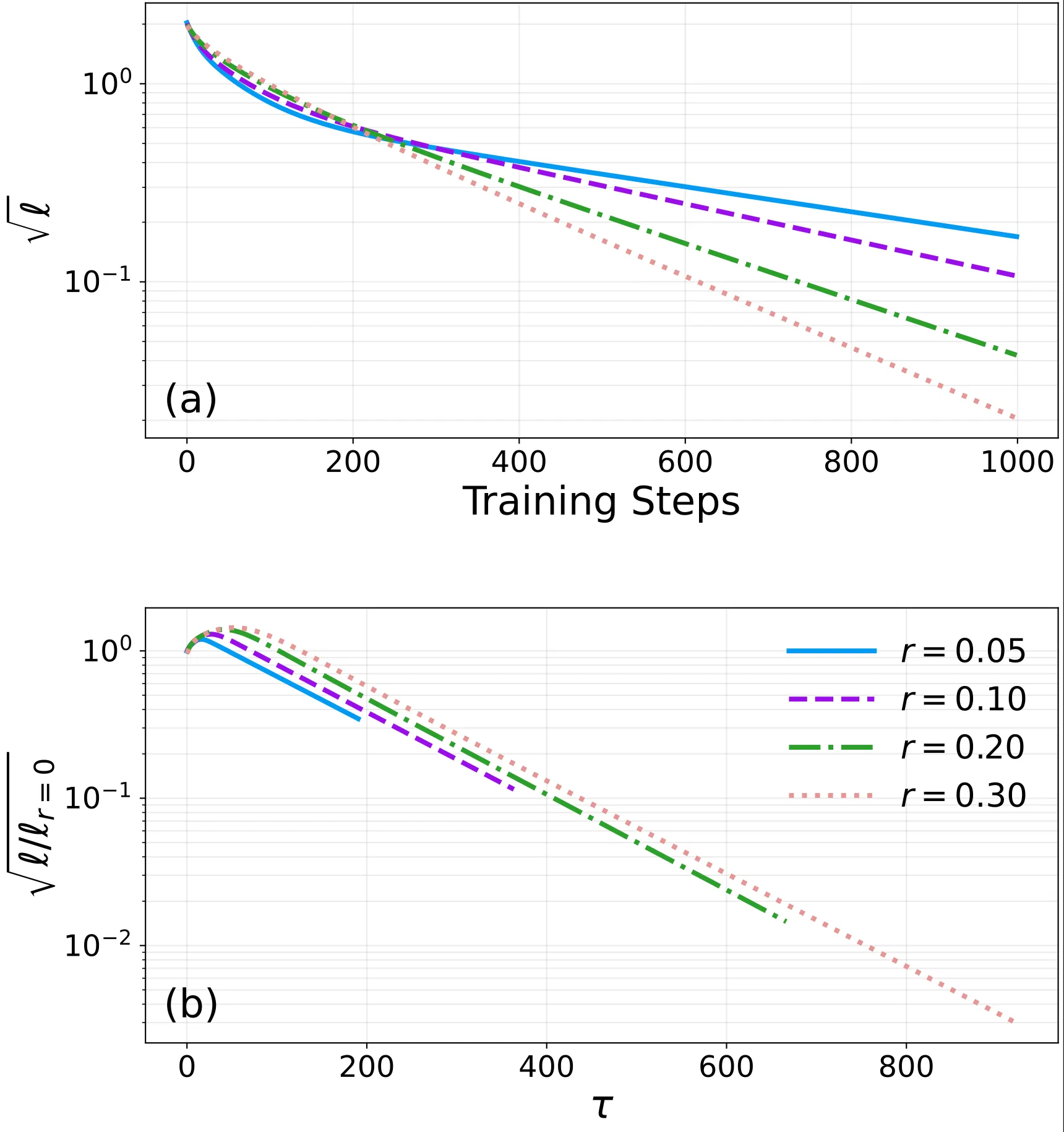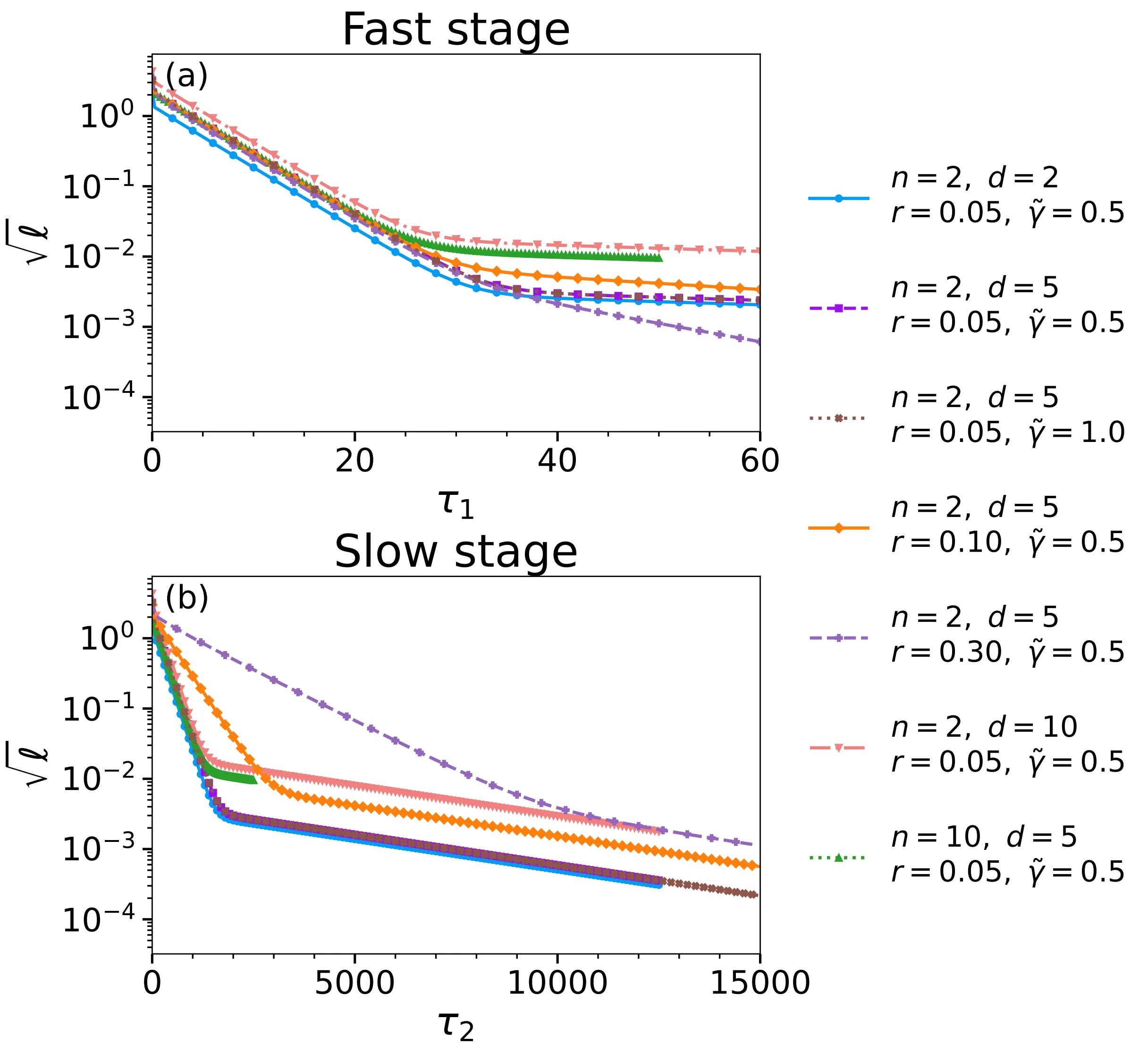 In the early stages of training, loss decreases rapidly, corresponding to the model learning clearly distinguishable clean samples. However, as time progresses, evolution inevitably enters a slow decay phase. If we rescale the time coordinate according to the effective frustration ratio